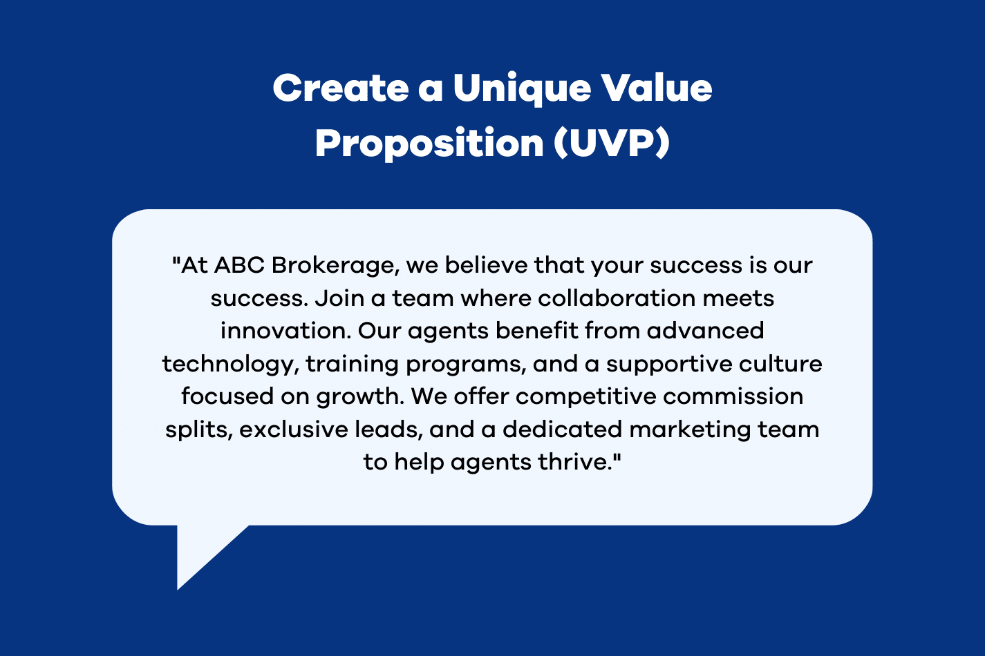 Whatever it is, you should be able to summarize these advantages clearly. Potential recruits need to understand your unique value proposition immediately. The top brokerages you’re competing with already have compelling UVPs that resonate with agents—you need one too.